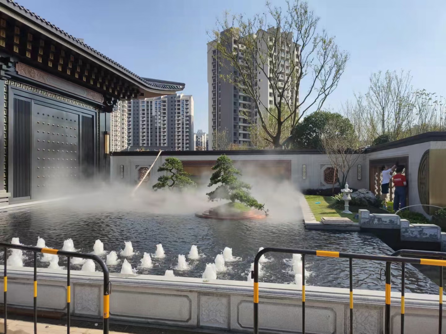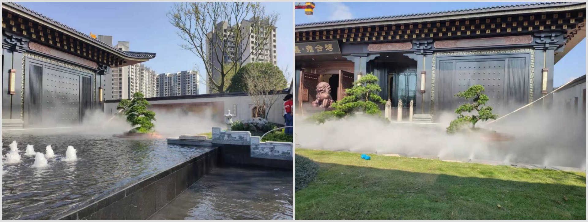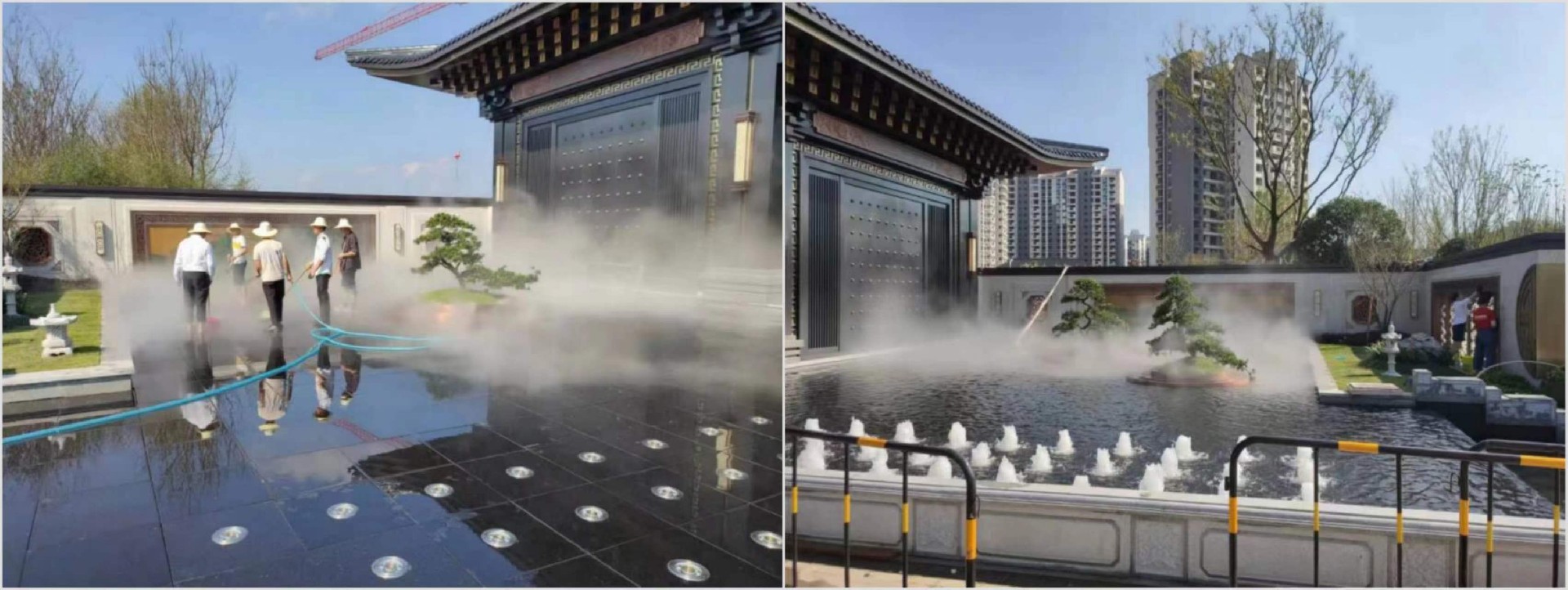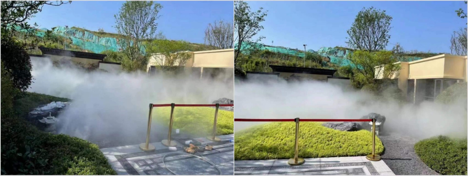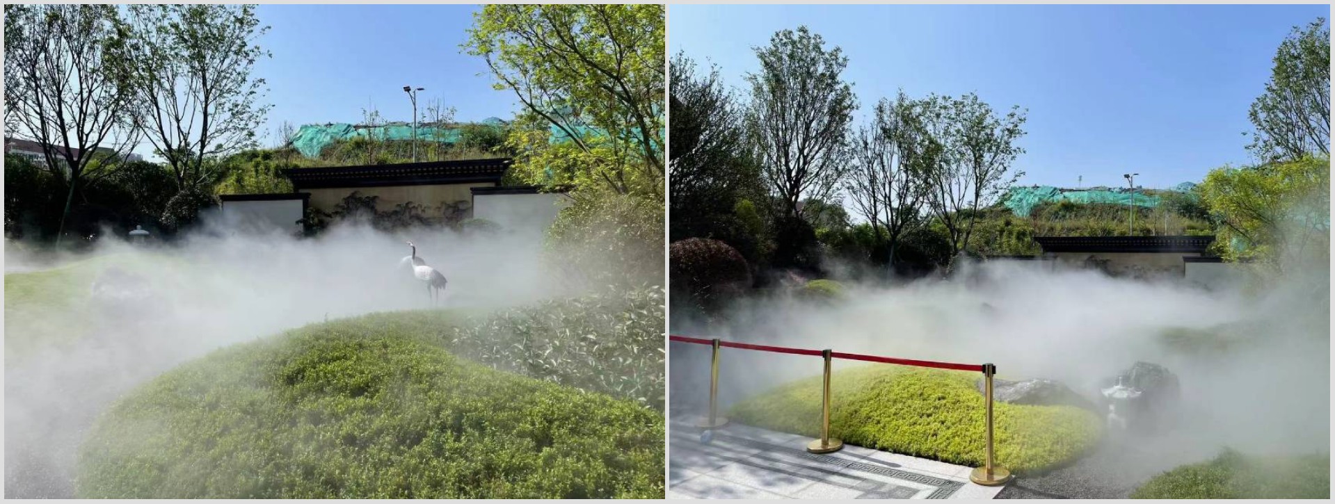 該項目承接于2021年9月2日,用時十二天完工。該項目占地面積600平方米,在地埋式伸縮噴頭的基礎上,增加了冷霧造景噴霧,使環境更加優美。